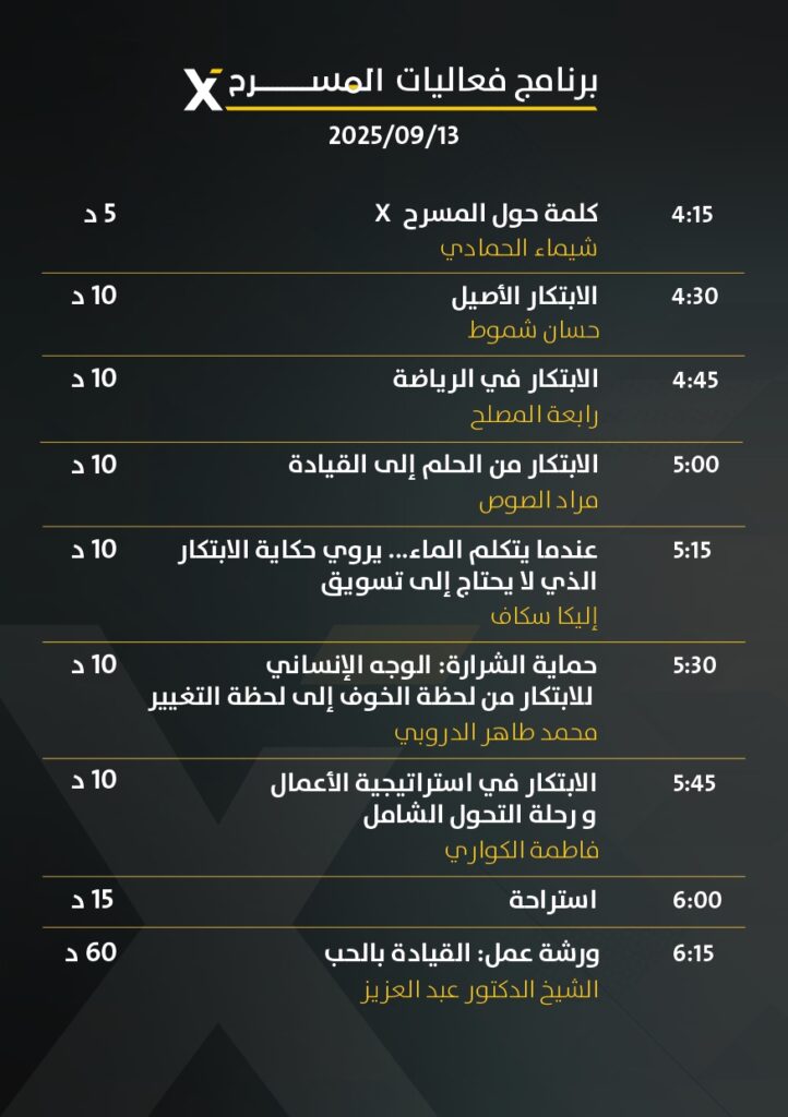 المسرح X" هو ملتقى شهري غير تقليدي يُعقد لأول مرة في الوطن العربي، مستوحى من روح منصة TED، لكنه يحمل طابعًا أكثر واقعية وقربًا من السوق الخليجي.يسلّط الملتقى الضوء على الجانب المجهول في مسيرة الشركات والأعمال: لحظات التحدي، الإخفاق، القرارات المصيرية، والمواقف الصعبة التي لم تُحكَ من قبل، تلك التي شكّلت العمود الفقري للنجاح الحقيقي."